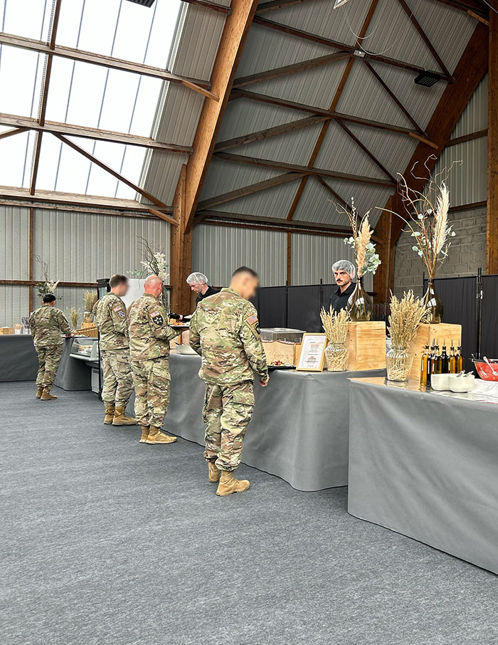 Catering services for receptions, events, military exercises, and temporary kitchen shortages.